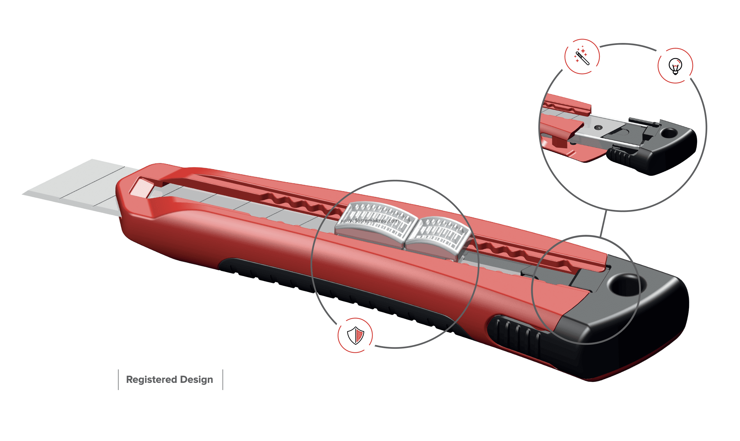 Práctico con cuerpo en acero de alta resistencia. Tecnología española con cuchillas alemanas de alta duración. Incluye 2 repuestos. Cuenta con bloqueo de seguridad de la cuchilla y recambio automático de cuchillas.