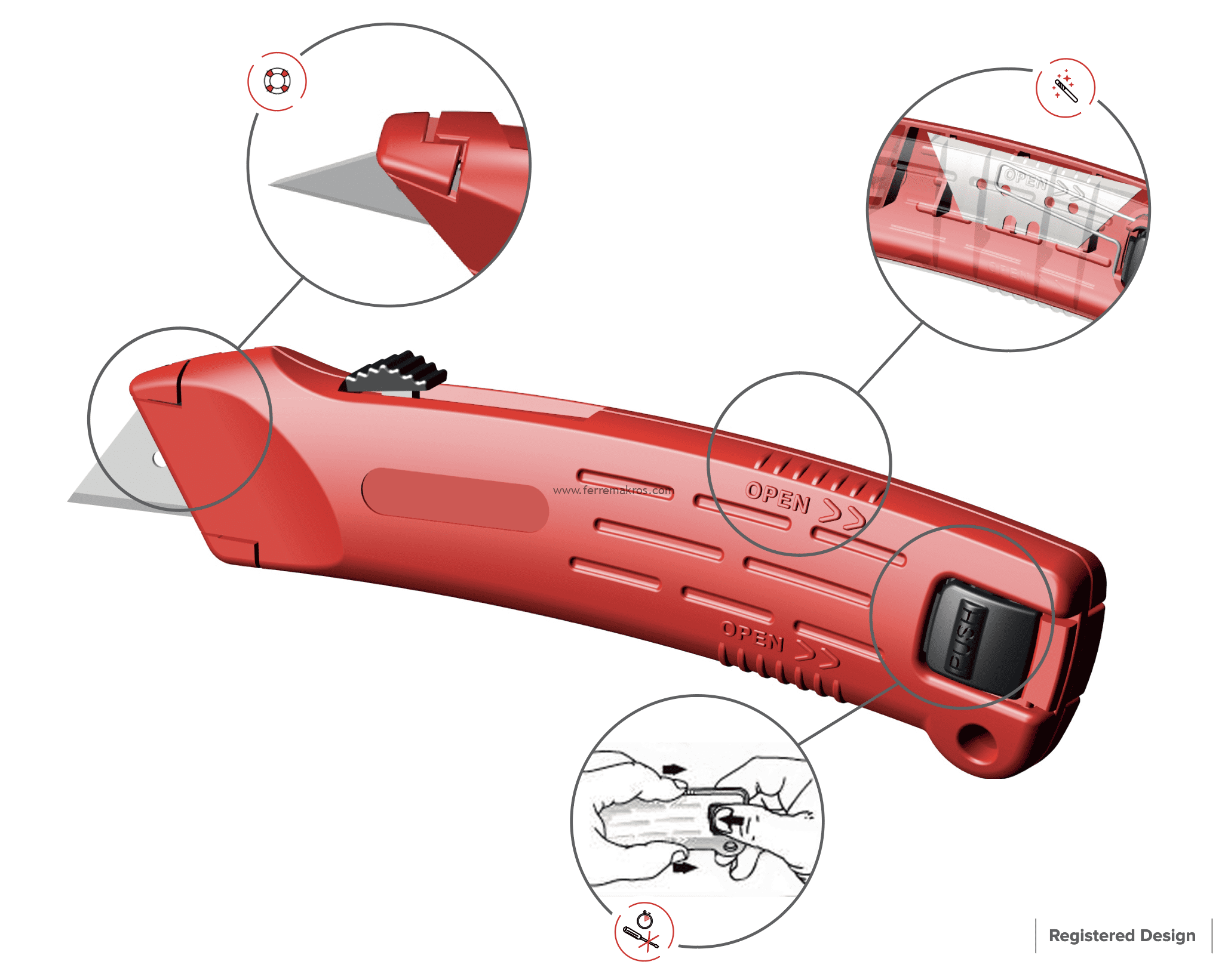 Ergonómico con cuerpo en acero de alta resistencia. Tecnología española con cuchillas alemanas de alta duración. Incluye 2 repuestos.